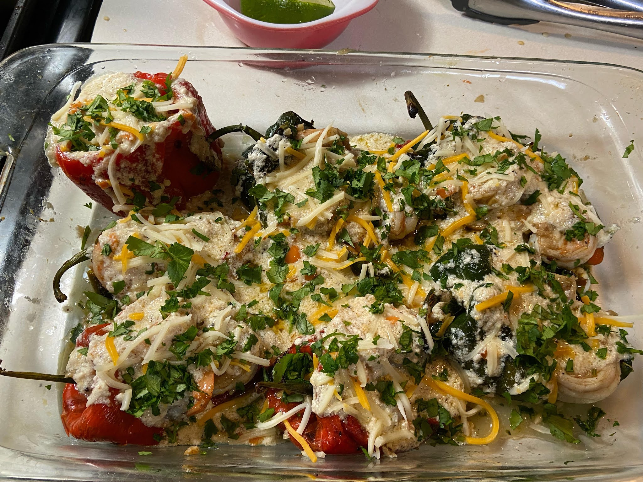 I traded some end of season figs from our fig tree to a friend at work for some end of season peppers he grew. Some of the peppers were poblanos. We wanted to do something different and possibly exciting with them. Well, exciting as far as poblano peppers go. They do have a flavor we enjoy but can be quirky by by sometimes tasting as mild as a bell pepper and other times having a nice punchy unexpected heat. So, we gave it some thought and poblanos really cry out to be stuffed but stuffed with what? Cheese? Good but too typical. Beef? Maybe. Chicken? Possibly, but with what else. Some kind of seafood? Hmmmm, yes but what? Crab, shrimp? Yes, shrimp but with what else? What seasonings? Lisa looked at a number of shrimp stuffed pepper recipes on line and we came up with few we could work with for poblanos. The result was amazing.Ingredients for two people -